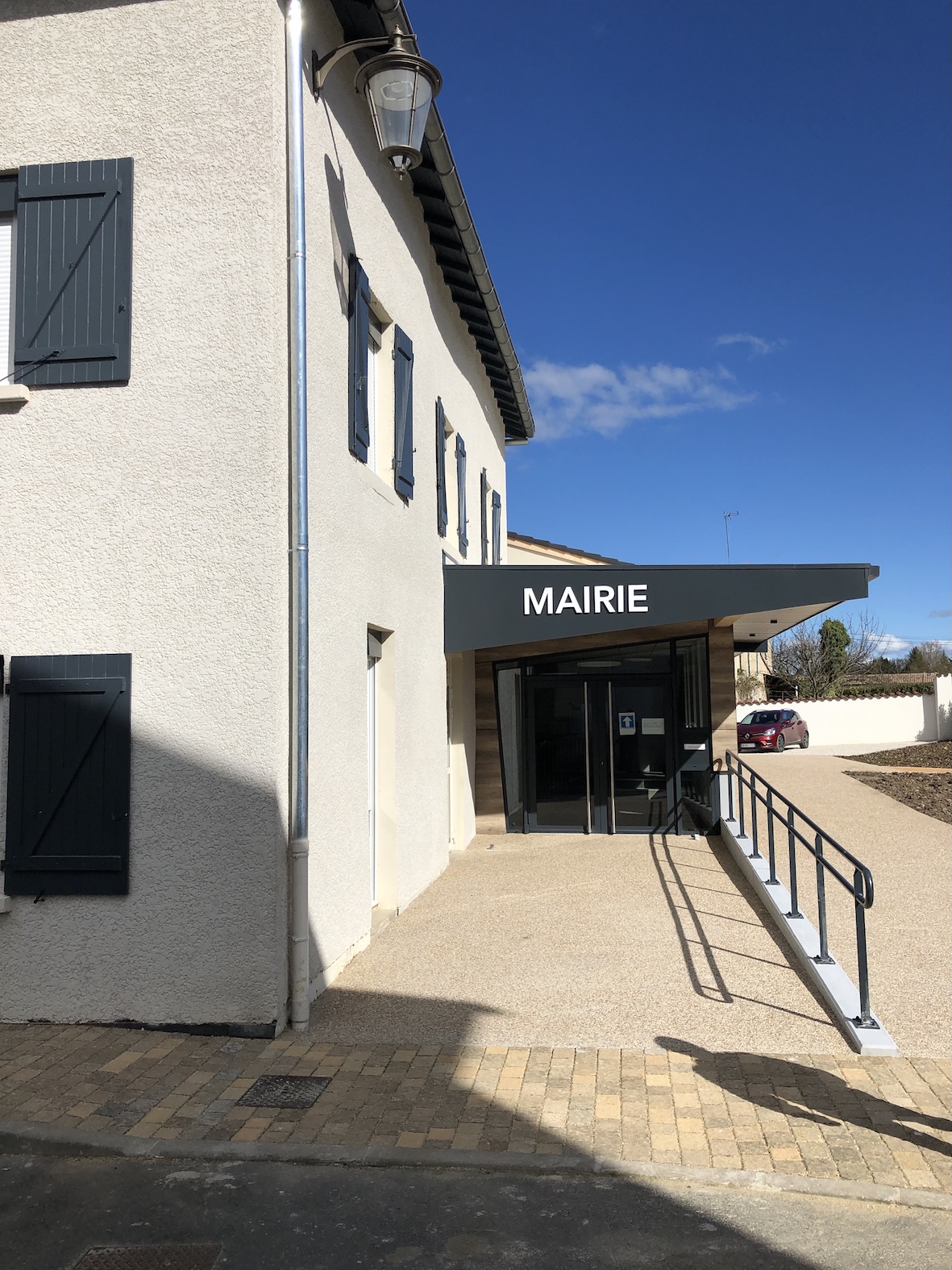Restructuration et agrandissement de la mairie avec création d’une nouvelle salle du conseil reprisent des flux publics et service, rénovation énergétique et traitement des abords.